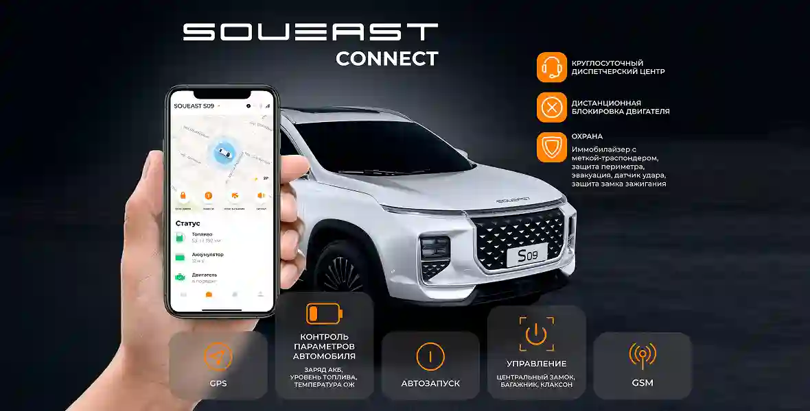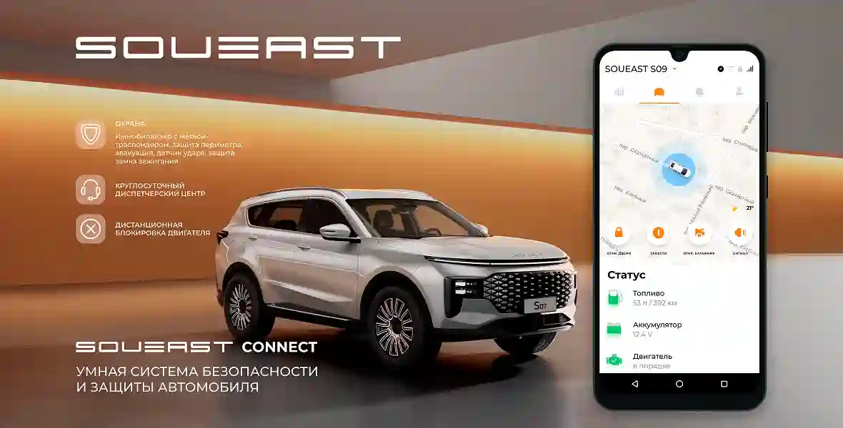 Бренд SOUEAST представил систему управления и защиты автомобиля SOUEAST охранно-телематическая система, созданную в сотрудничестве с партнерами компании. Охранно-телематический комплекс SOUEAST охранно-телематическая система — это система дистанционного контроля и управления функциями автомобиля SOUEAST с помощью мобильного приложения. Инновационное решение предоставляет доступ к облачным сервисам, где в режиме реального времени ведется сбор и анализ данных о транспортном средстве, а также защищает автомобиль от угона.